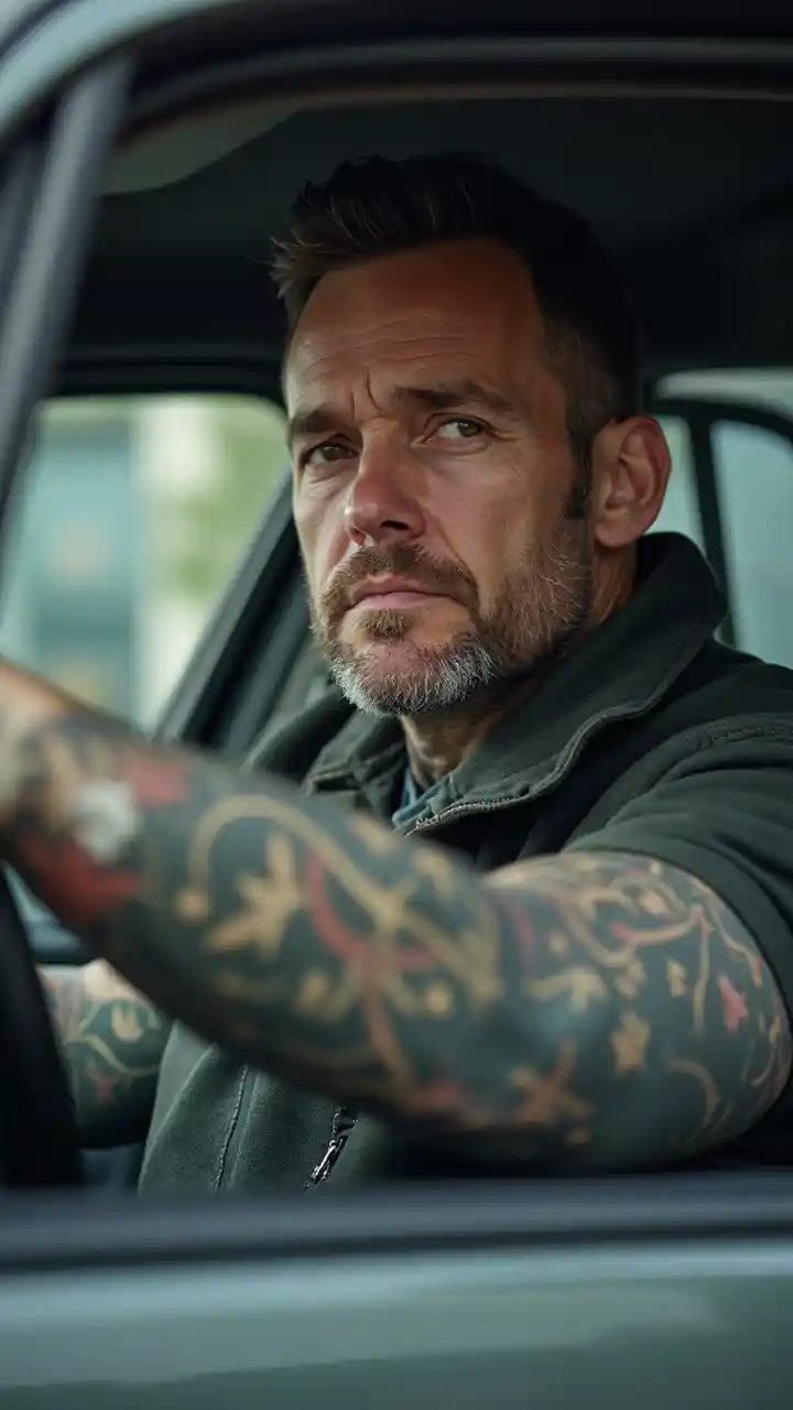 40 کی دہائی کے وسط میں ٹیٹو والا شخص گاڑی چلا رہا ہے، جس میں دکھائی دینے والی اداسی ہے