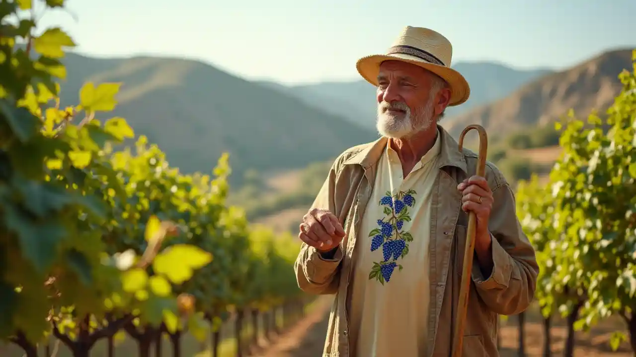ایک 80 سالہ مشرق وسطیٰ کا آدمی ایک وادی میں انگور کا باغ دیکھ رہا ہے۔ اس کے ہاتھ میں ایک چھڑی ہے اور اس کے ہاتھ میں انگور کا ایک کڑا ہے۔ اس کے ارد گرد کے پہاڑ اور شہد کی مکھیوں کا شور اس کے اندر ہے، اس کی احتیاط سے کٹائی ایک متحرک، قدرتی منظر میں صبر اور زمینی حکمت کا اظہار کرتی ہے۔ اس کے ہاتھ زمین کو پالتے ہیں