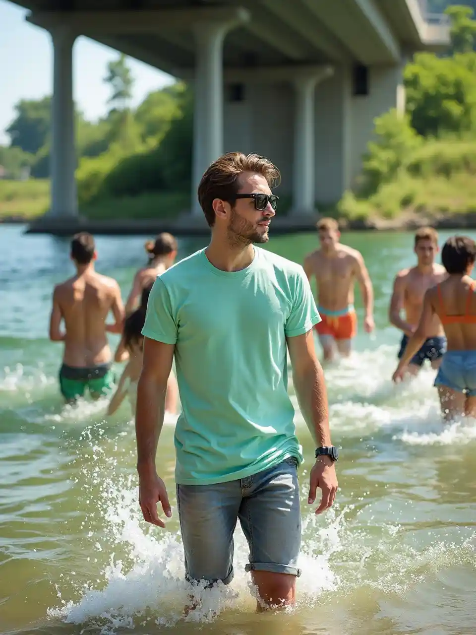 ایک نوجوان جو ایک وسیع کنکریٹ پل کے نیچے گہرا پانی میں کھڑا ہے، ایک ٹینٹ سبز ٹی شرٹ اور ایک خوبصورت دھوپ میں ایک طرف دیکھ رہا ہے، ایک آرام دہ اور پرسکون رویہ کا اظہار کر رہا ہے۔ سورج کی روشنی سے موسم گرما کی خوشگوار توانائی سے بھرپور ماحول پیدا ہوتا ہے۔ اس کے پیچھے مختلف عمر کے لوگ پانی میں گھوم رہے ہیں۔ کچھ کھیل کر لطف اندوز ہو رہے ہیں جبکہ کچھ آرام سے سماجی ماحول میں مشغول ہیں۔ دریا کے کنارے کی سرسبز سبزیاں تازگی کا ایک برعکس دیتی ہیں، اور دن کی بے فکرگی کو بڑھا دیتی ہیں۔