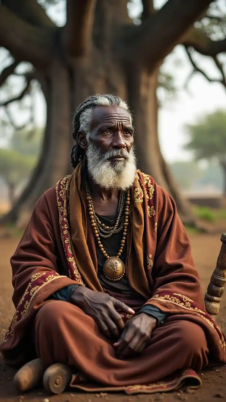 Một ông già châu Phi khôn ngoan với những nếp nhăn sâu và đôi mắt sắc sảo đang ngồi dưới một cây bao báp khổng lồ ở trung tâm của một ngôi làng bí ẩn. Anh ta có làn da ngăm đen, đầy sương gió, bộ râu trắng dài và được tết gọn gàng. Ông mặc một chiếc áo choàng màu nâu đất và đỏ thẫm, thêu hoa văn vàng tượng trưng cho sự khôn ngoan. Trên cổ hắn, một chuỗi hạt gỗ có khắc bùa hộ mệnh tựa vào trước ngực. Hắn chăm chú nhìn phương xa, vẻ mặt nghiêm túc, như có điều suy nghĩ, lạc vào trong ký ức quá khứ. Hai bàn tay của ông, tuy già nhưng rắn chắc, đặt trên một cây gậy gỗ được trang trí bằng những bùa chú và biểu tượng nhỏ.