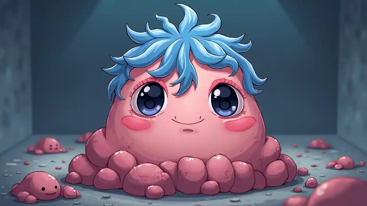 Anime, một loạt các sinh vật có thịt với đôi mắt đen rắn chắc và mái tóc màu xanh bao quanh nó.