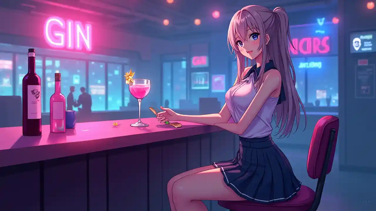 Anime cô gái mặc váy ngắn với gin trong một quán bar neon