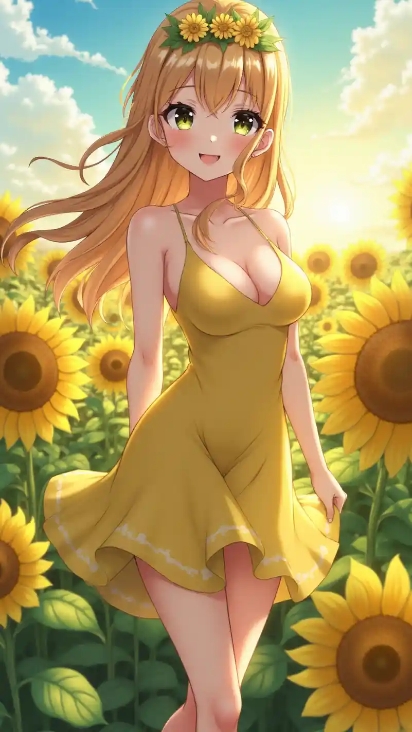 Cô gái anime độ nét cực cao với hình ảnh quy mô lớn theo chiều dọc, vẻ đẹp quyến rũ và khiêu khích, tắm trong thời gian vàng, đứng trên cánh đồng hoa hướng dương dưới bầu trời sáng ngoài trời, mặc quần áo mùa hè, cổ áo rủ xuống, đội vương miện hoa, mái tóc dài bắt ánh sáng, nụ cười rạng rỡ, đôi mắt to lấp lánh, làn da tỏa sáng, bảng màu vàng-xanh lá cây nắng, các đặc điểm mềm mại, trang điểm hoàn hảo, bầu không khí vui vẻ và sôi động, ánh sáng mềm mại và ánh sáng tự nhiên, làm nổi bật sự quyến rũ của cô, Bộ ngực rõ ràng có khe hở tinh tế, chân dài săn chắc có tư thế thoải mái, toát lên vẻ đẹp và niềm vui.