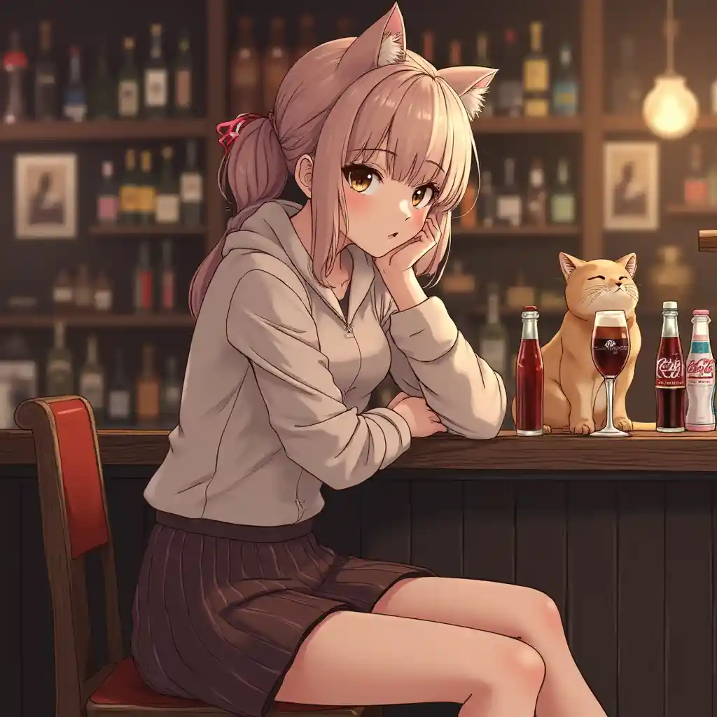 Anime nữ và mèo ngồi trong quán bar, Coca-Cola thở dài