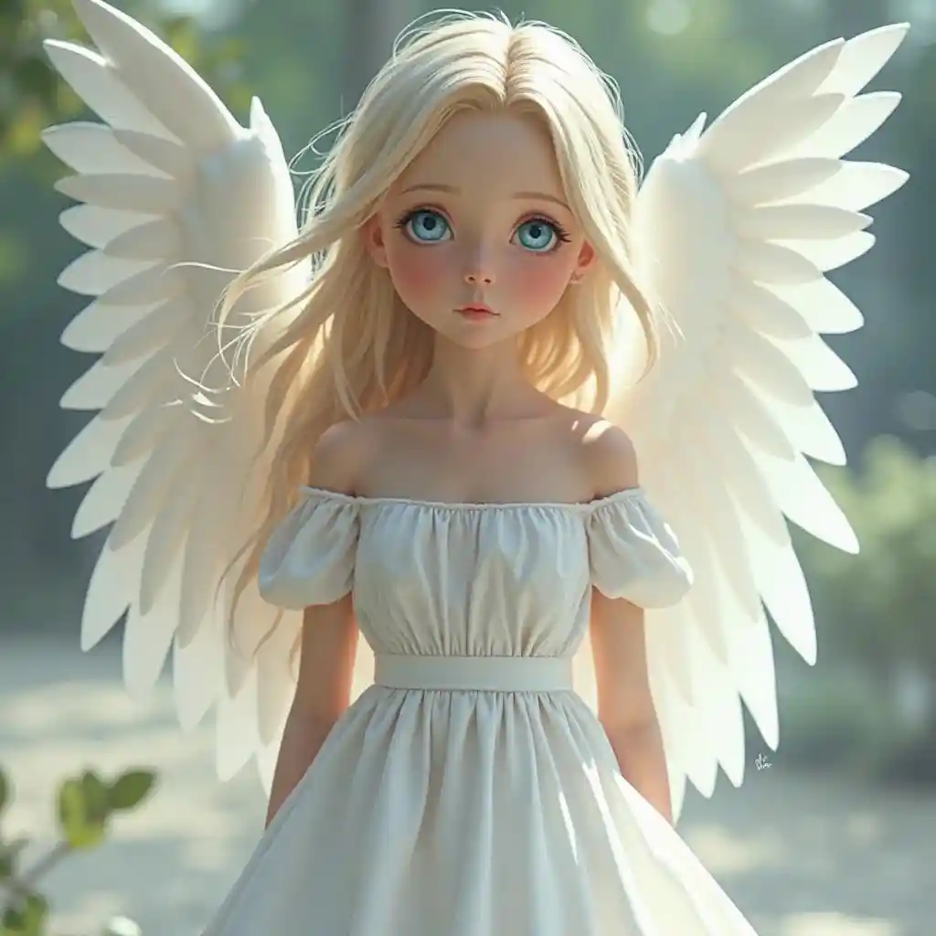 Cô gái xinh đẹp Anya, chiếc váy dài màu trắng với đôi cánh trắng uy nghi, mái tóc vàng và ánh sáng, xuyên qua đôi mắt màu xanh, nó có khuôn mặt đối xứng, đôi môi và