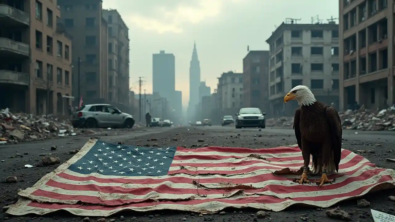Một thành phố lớn bị phá hủy sau thảm họa hạt nhân hoặc sau chiến tranh thương mại, với rác thải, các tòa nhà bị phá hủy và bỏ hoang, mảnh vỡ và bụi, ô tô bị phá hủy, bầu trời xám xịt và u ám, đường phố trống rỗng, phía trước là một lá cờ Mỹ bị xé rách rất lớn trên mặt đất và một tiêu đề có nội dung quot; TARIFFS! quot; Tờ báo có một bức ảnh đổ nát của Donald Trump, gần lá cờ là một con đại bàng đang đứng, nhìn xuống lá cờ với vẻ mặt buồn bã, lá cờ bị xé làm đôi, tuyệt vọng, thất bại, Một cuộc chiến tranh kết thúc và có một robot Hi Tech bị đốt cháy nằm trên mặt đất gần một lá cờ, với một cái đầu hơi nứt. Sự pha trộn của sự tôn trọng.