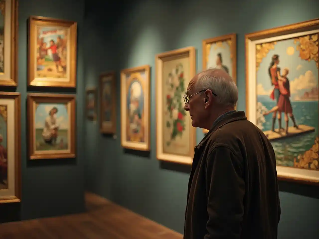Người già trong phòng trưng bày tranh cổ điển