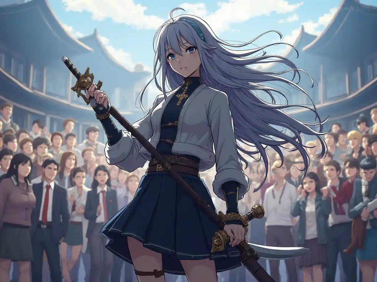 Một nhân vật anime với mái tóc dài và thanh kiếm trong tay, đứng trước một nhóm người, Aya Goda, Lekko Art, Key Vision, Poster Art