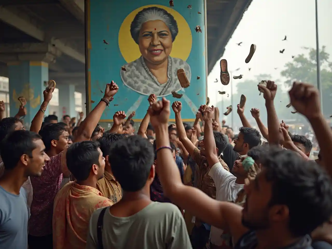 Một cảnh tượng mạnh mẽ và mang tính biểu tượng của những người biểu tình Bangladesh, với sự giận dữ và khinh miệt bùng cháy trên khuôn mặt của họ, ăn mừng chiến thắng quan trọng chống lại chế độ Sheikh Hasina, được coi là nguồn gốc của sự áp bức. Họ tức giận ném đôi dép vào bức chân dung cao chót vót của Sheikh Hasina được vẽ trên cột tàu điện ngầm, tượng trưng cho sự căm ghét sâu sắc của họ đối với chủ nghĩa độc tài và bất công. Bộ cảnh cứng nhắc, xuất phát từ trái tim, nắm bắt được một đám đông đoàn kết bay dép và giơ lên nắm đấm. Bầu không khí đầy bạo lực và nổi loạn, phản ánh thời điểm quan trọng của bất ổn chính trị. Bài văn tập trung vào hành vi phản kháng, khắc họa sinh động sự phẫn nộ và khinh miệt tập thể của nhân dân.