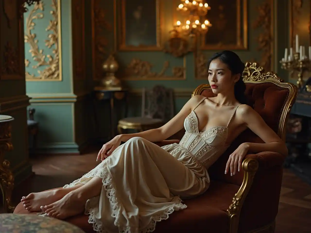 Một phụ nữ châu Á ở độ tuổi 30 đang ngả người trên chiếc ghế tựa bằng nhung trong một salon kiểu baroque, mặc một chiếc váy bó sát với những đường cắt ren quyến rũ. Gương và đèn chùm lộng lẫy đóng khung cô, và thiết kế bắt chéo chân và ngực thấp của cô toát lên sự quyến rũ và sang trọng quyến rũ trong bối cảnh lịch sử tráng lệ.