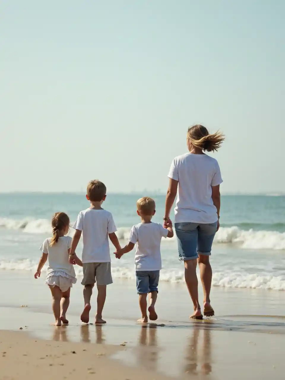 Một người phụ nữ dẫn chồng và ba đứa con (2 trai và một gái) đi dạo dọc bãi biển