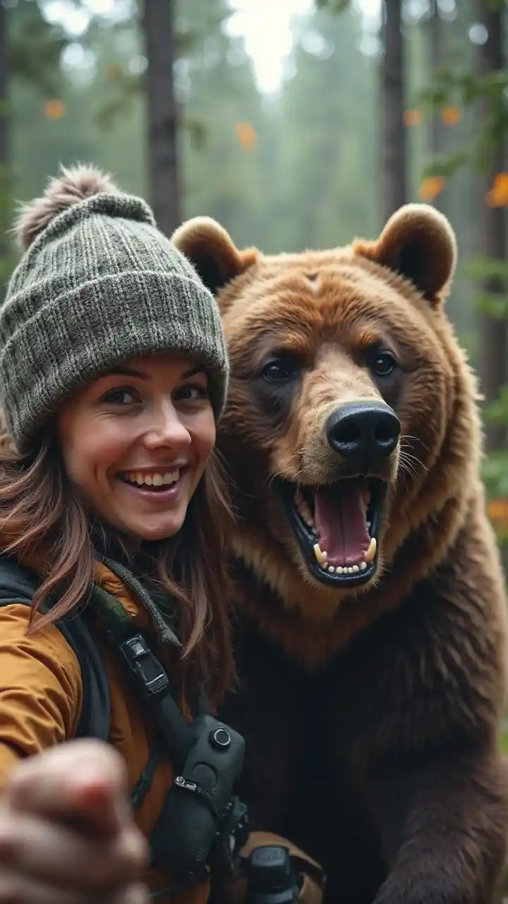 Một nữ nhà thám hiểm trẻ ở British Columbia, Canada chụp ảnh tự sướng với gấu xám giận dữ, vị trí trong rừng