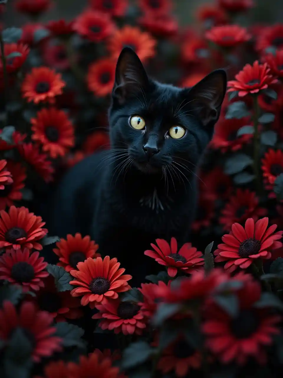AidenMột con mèo đen được bao quanh bởi hoa đen và hoa đỏ trong một đống, nhìn lên máy ảnh, một bức ảnh chứng khoán, nghệ thuật ý tưởng, thực tế