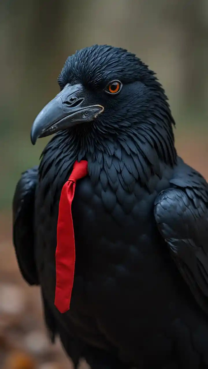 Một con quạ đen đeo cà vạt đỏ