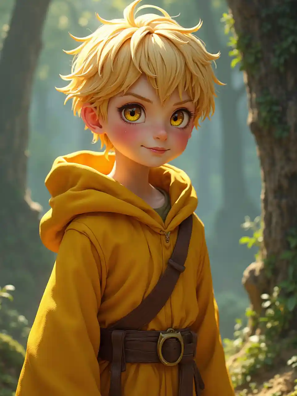 Nghịch ngợm 8 tuổi nam con người phù thủy trong thế giới tưởng tượng, với một mái tóc vàng ngắn màu cát và một đôi mắt vàng mặc áo choàng màu vàng.