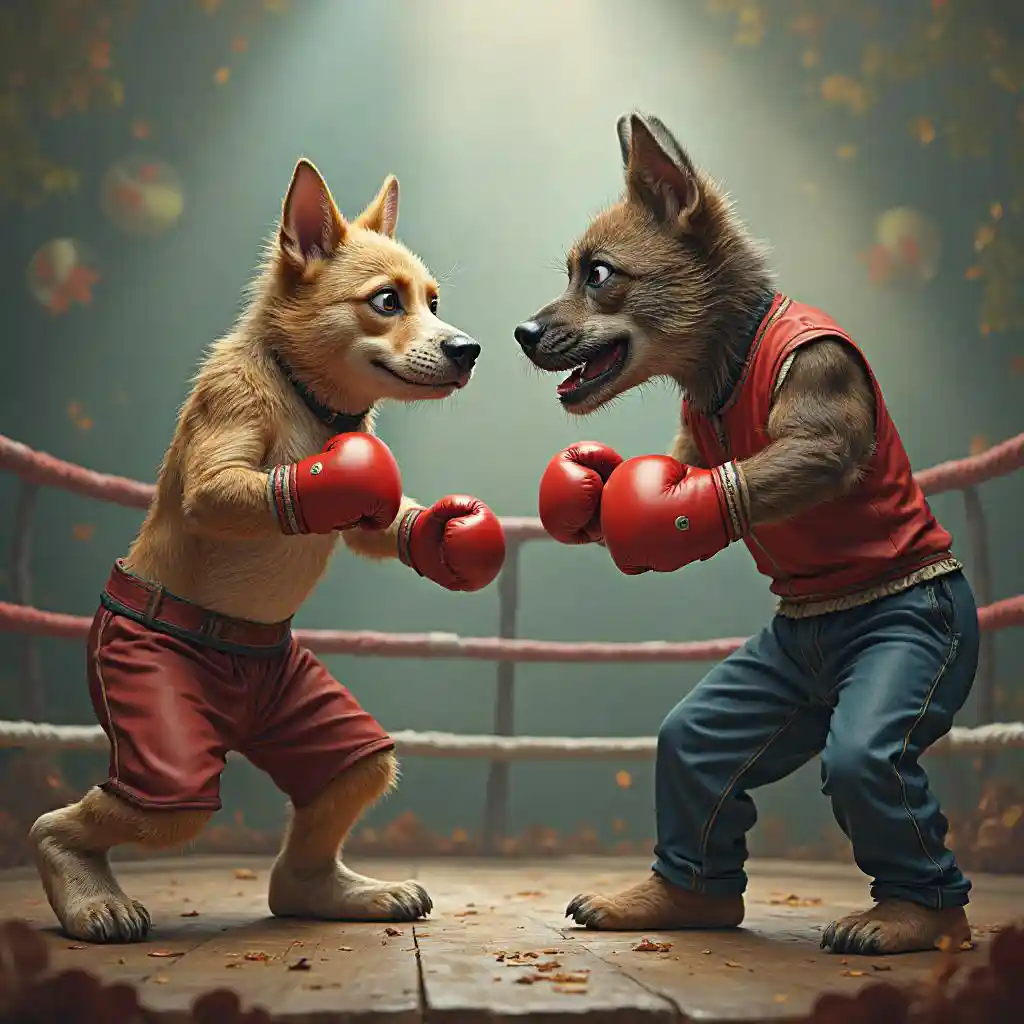 Một hình ảnh của một trận đấu quyền anh với hai đối thủ kỳ lạ: một con chó đeo găng tay đấm bốc và cá hồi xanh ở phía bên trái của hình ảnh (linh mục Alleman); trên