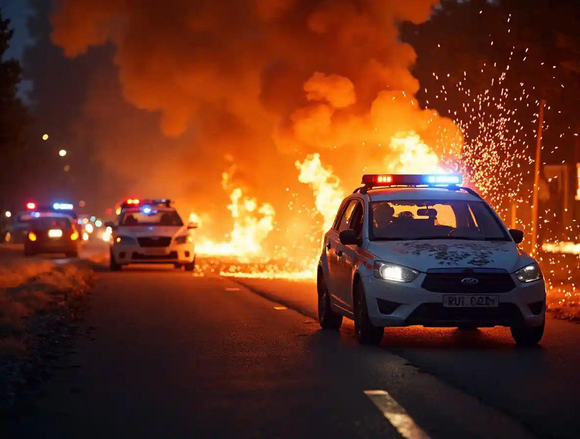 TinaXe cảnh sát bốc cháy, nền bị phá hủy, tàn dư của vụ nổ và các hạt tia lửa lan khắp không trung và mặt đất vào ban đêm