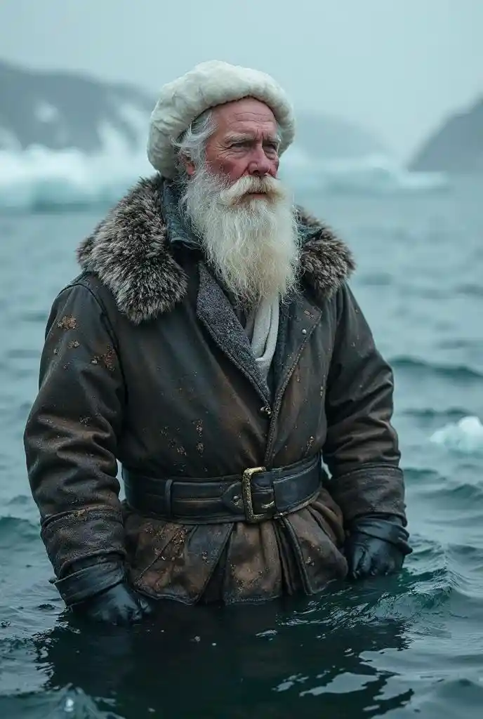 Bức chân dung chân thực của thuyền trưởng Edward John Smith, người có bộ râu trắng, đội mũ trắng và ưỡn ngực đứng trong làn nước băng sâu trên con lai