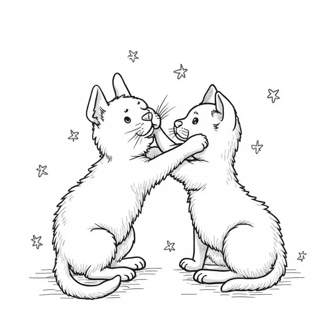 RoyB amp; W trang sách màu, dòng nghệ thuật, hai con mèo chơi, nền trong suốt. Kích thước hình ảnh phù hợp với trang 6x9 inch, độ phân giải 300 DPI