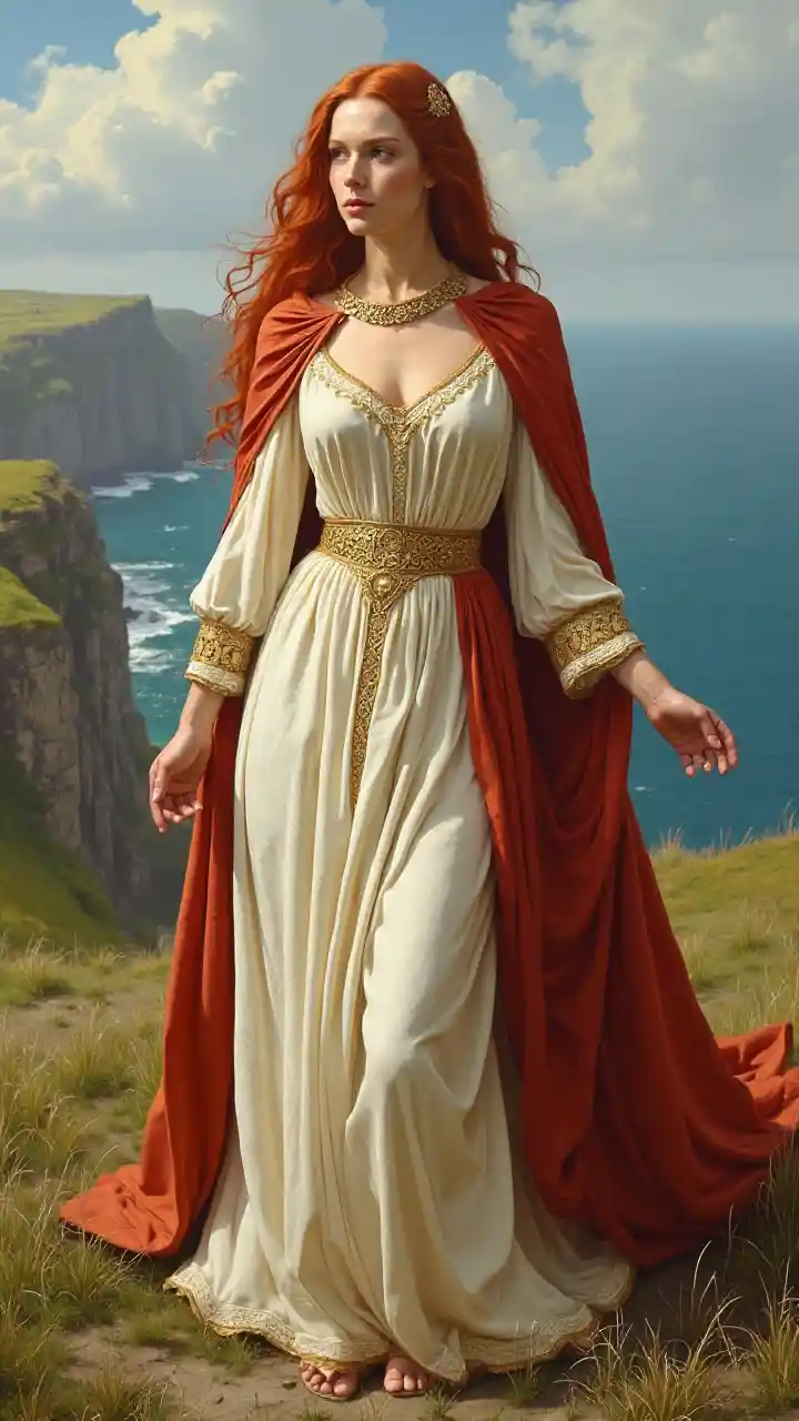 Một người phụ nữ trông giống như nữ diễn viên Jessica Chastain là một nữ hoàng Celtic cổ đại, mặc một chiếc váy trắng với một phụ kiện Celtic vàng và một chiếc áo choàng màu đỏ. Cô để một mái tóc dài màu đỏ, trên một khoảng đất trống trên đỉnh núi, nhìn ra biển Ireland. Phong cách sơn dầu Alma Tadema chi tiết cao.