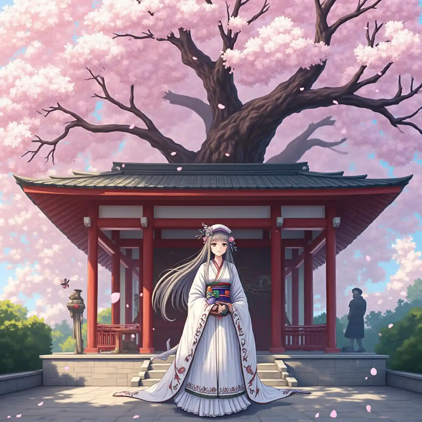 Mùa xuân. Đền thờ Nhật Bản có một cây anh đào lớn. Những cánh hoa anh đào tung bay trong không khí. Cô gái xinh đẹp quyến rũ đứng