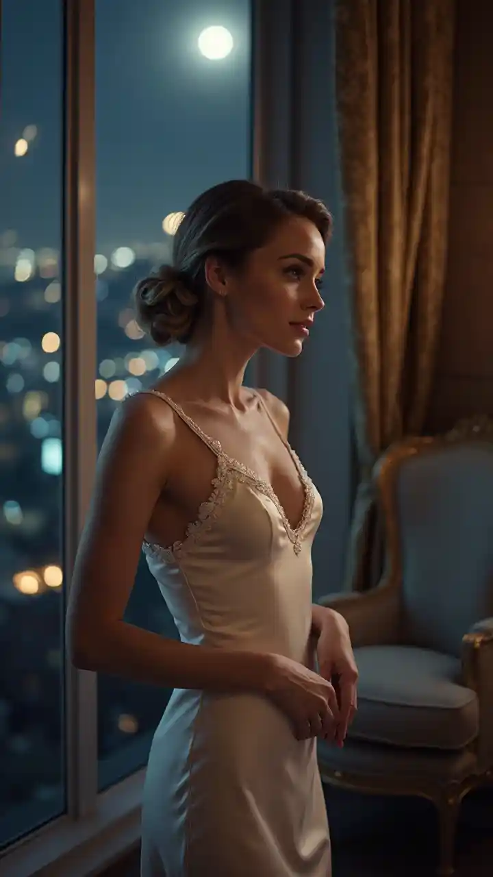 Hãy tưởng tượng một người phụ nữ mặc một chiếc váy lụa trắng sang trọng, đứng bên một cửa sổ tráng lệ với tầm nhìn ra thành phố vào ban đêm. Chiếc váy vừa vặn với các chi tiết ren tinh tế ở cổ áo và eo, và khi tư thế của cô thay đổi, nó di chuyển duyên dáng xung quanh chân cô. Ánh trăng dịu dàng xuyên qua cửa sổ, chiếu ánh sáng bạc lên người cô, khiến làn da cô trông hoàn mỹ. Mái tóc của cô được chải thành những lọn xoăn mềm mại và duyên dáng, đôi mắt nhìn chằm chằm vào ánh đèn thành phố bên ngoài, mang đến cho người ta một vẻ mặt trầm tư nhưng quyến rũ. Bầu không khí mạnh mẽ của căn phòng, với đồ nội thất sang trọng và ánh sáng mờ, phù hợp với vẻ đẹp của cô, tạo ra một bầu không khí thân mật, gợi cảm, nơi cô đứng như một khung cảnh thanh lịch và duyên dáng.