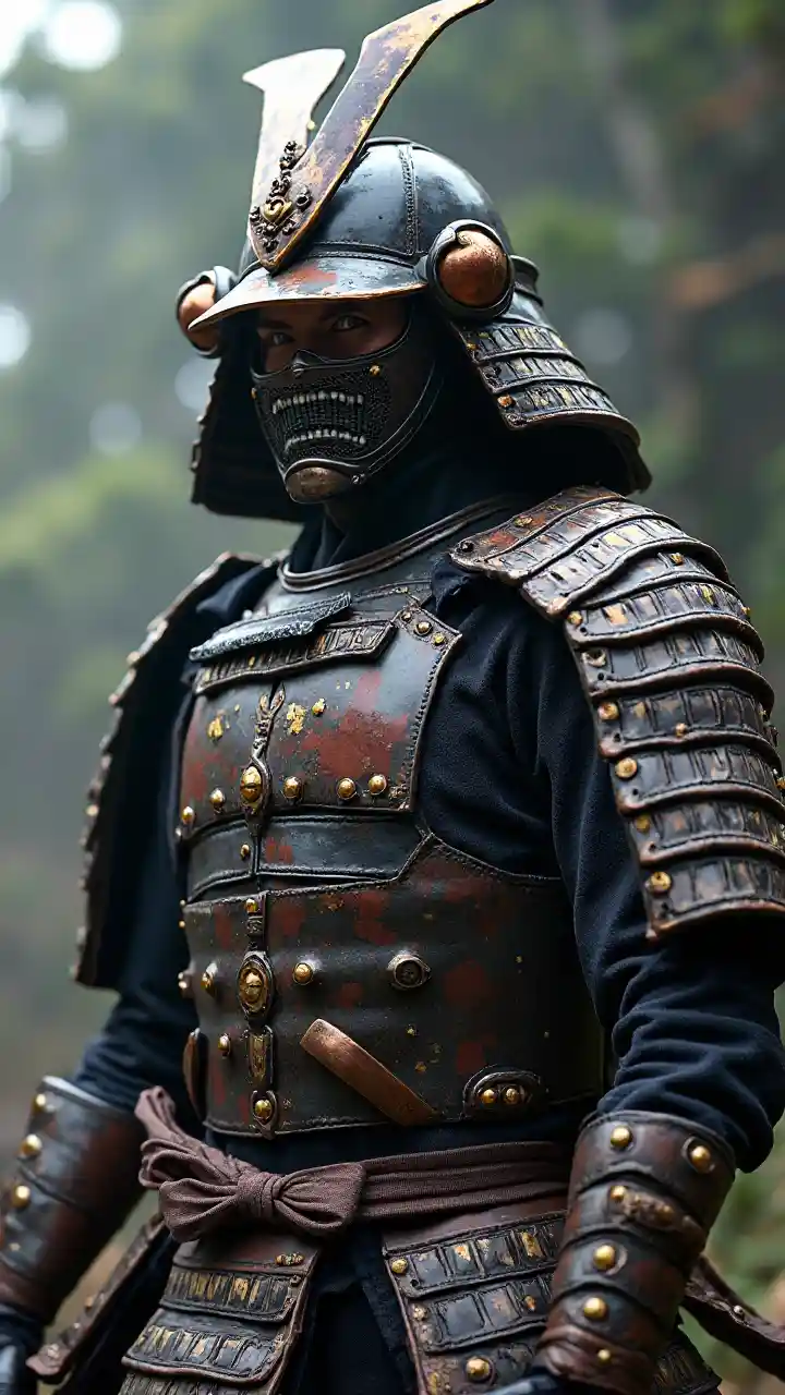 Samurai với áo giáp chrome chi tiết, tương lai, khoa học viễn tưởng, chất lượng điện ảnh, siêu thực tế.