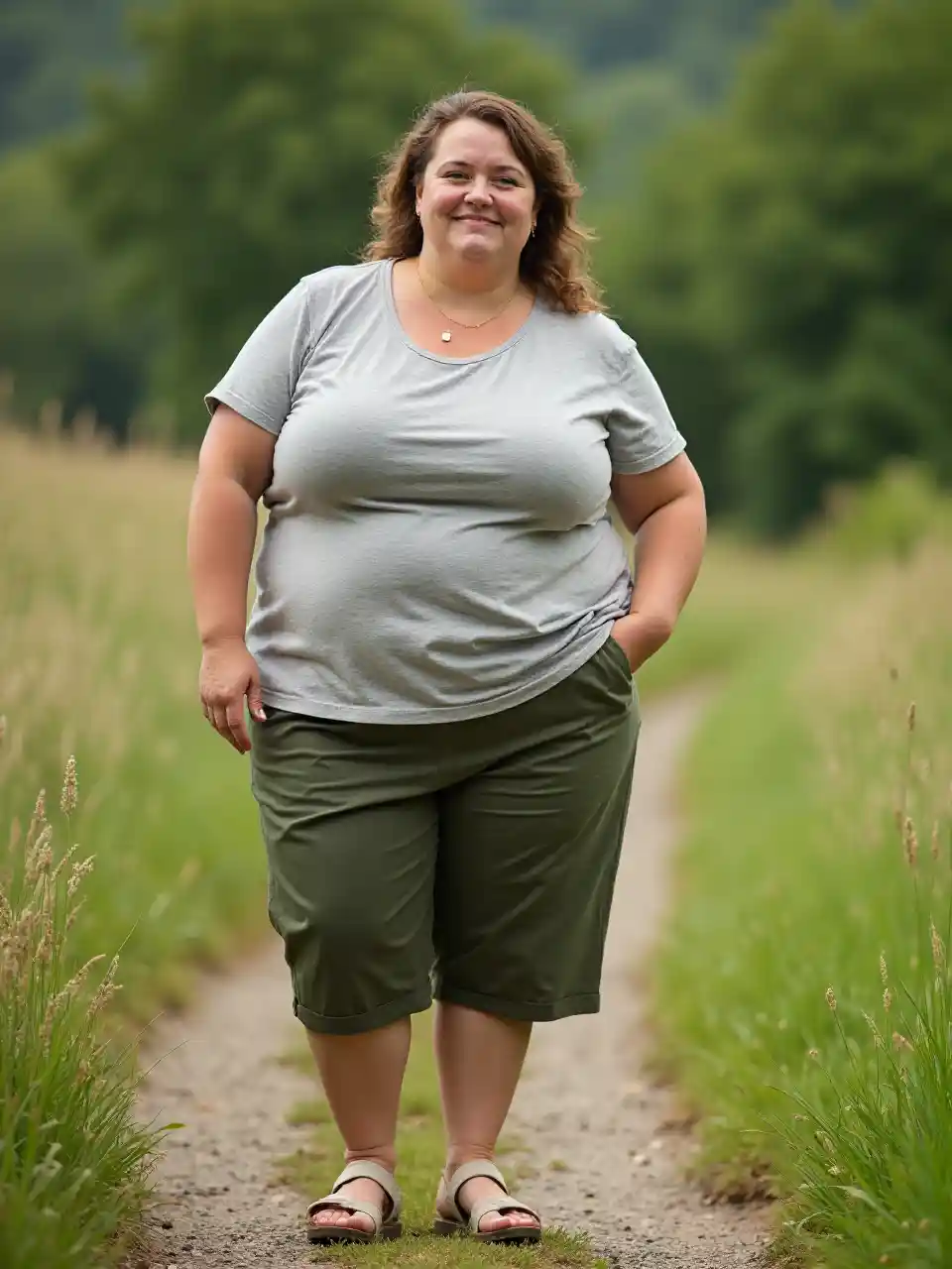 HudsonToàn thân chụp ảnh, thừa cân rất béo, XXL, 40 tuổi màu trắng châu Âu béo nữ, mặc hai mảnh quần áo, đứng trong dép phẳng, trên con đường cỏ