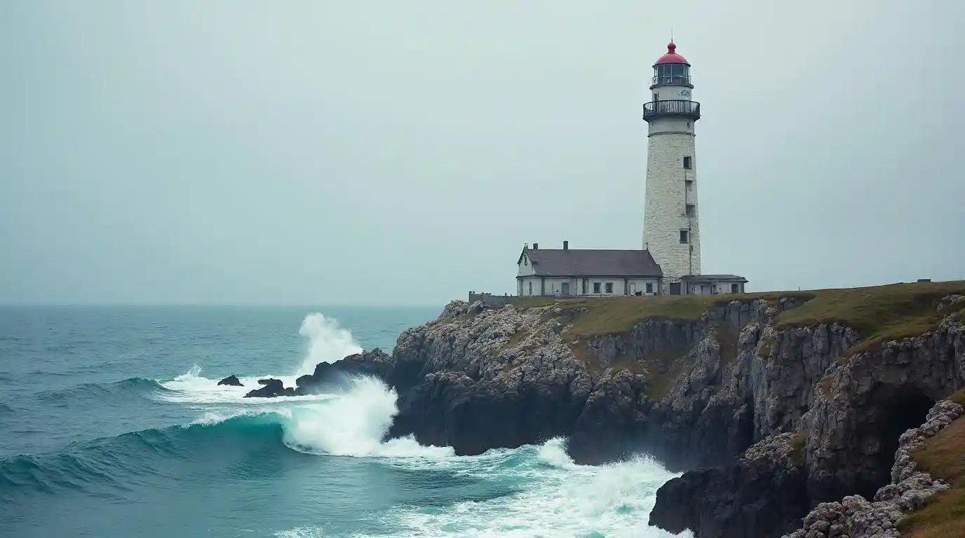 GiselleMột ngọn hải đăng cổ trên đường bờ biển gồ ghề, với những con sóng vỗ vào đế của nó.