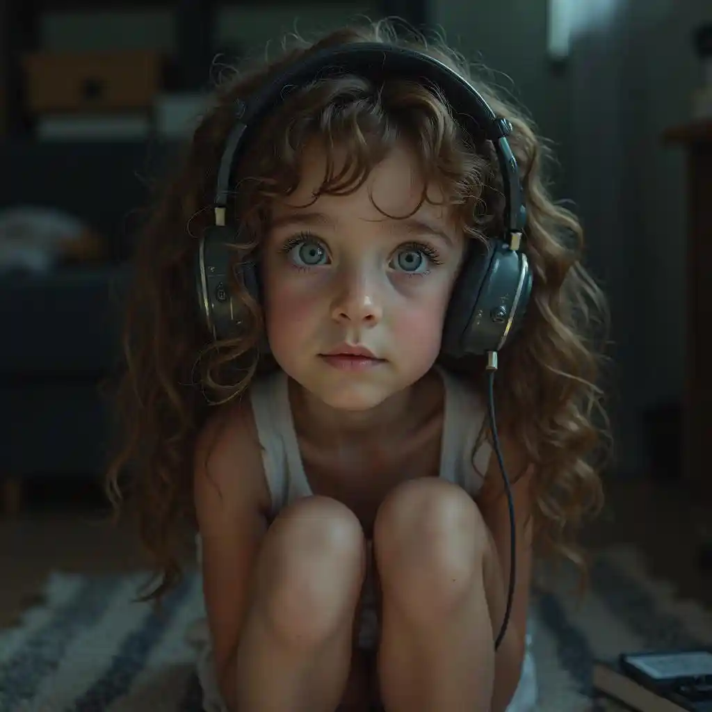 Cô gái tóc xoăn đeo tai nghe trong phòng tối