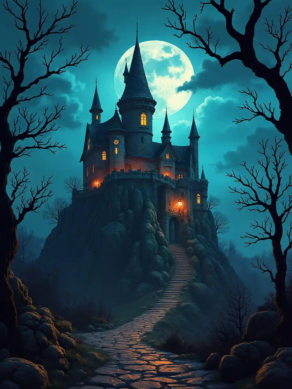 HarrisonLâu đài kinh dị Gothic ban đêm, màu sắc tươi sáng, phong cách ép gỗ, darkfantasy