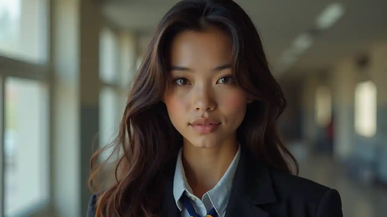 Phụ nữ thực tế, mái tóc đen dài, làn da rám nắng, học sinh mặc đồng phục để chụp ảnh