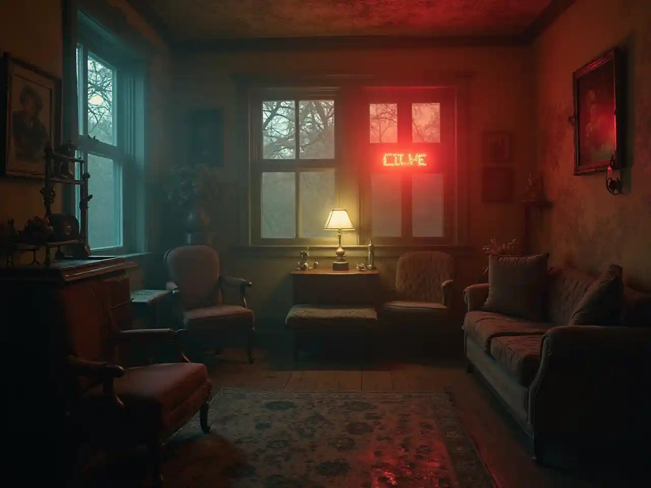 PeytonDưới phong cách của nền kinh dị và tình yêu, phòng tối sương mù, với đồ nội thất retro, hình ảnh tổng thể cảm thấy như một sự kết hợp của màu đỏ và vàng, siêu thực