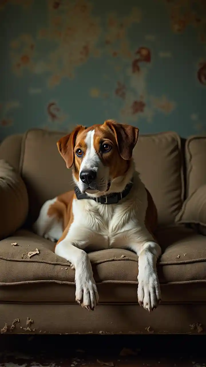Một con chó đang nằm trên một chiếc ghế sofa phong cách retro bị xé thành nhiều mảnh.