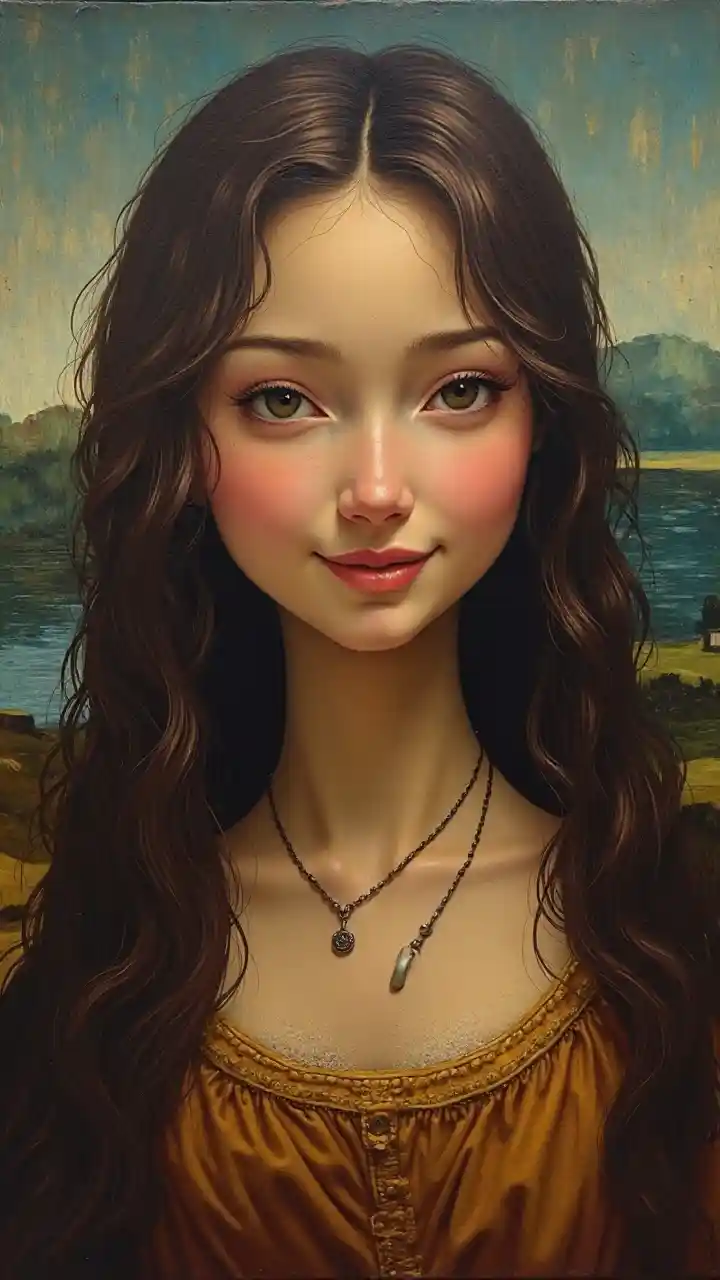 Một bức tranh của một người phụ nữ với mái tóc dài và nụ cười trên khuôn mặt, với bối cảnh là một phong cảnh, Dora Maal, Nghệ thuật tạo hình, Da Vinci, một bức tranh