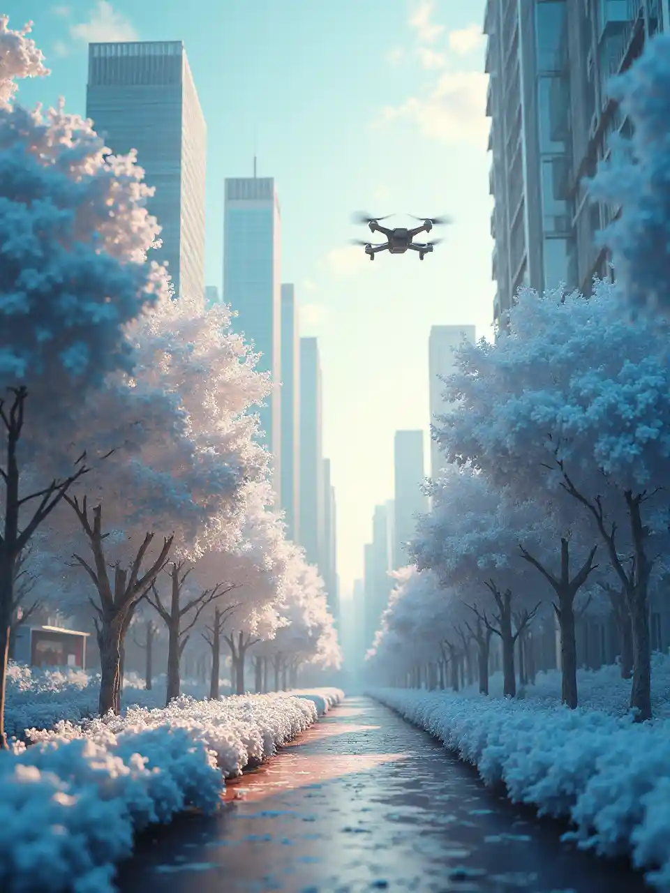 Một bên đường là một hàng cây trắng, bên kia đường là một tòa nhà chọc trời cao chót vót. Một chiếc máy bay không người lái đang bay trên không. Ánh sáng huyền diệu. 3D tưởng tượng. Phong cách siêu thực. Siêu chi tiết. Màu sắc khác nhau của ánh nắng mặt trời. Bóng tối. Vi khuẩn màu tím xanh lam trắng với cánh hoa và lá.