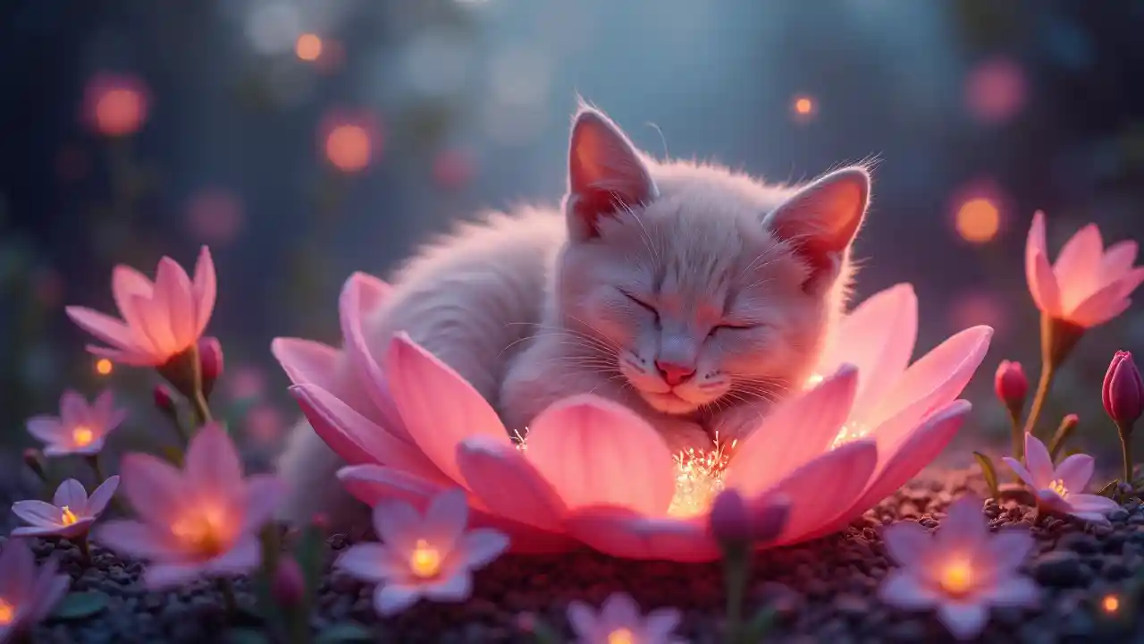 Một ((((mèo con màu hồng dễ thương))), với ((hoa nở rực rỡ)) tỏa ra ánh sáng ấm áp, thoải mái định cư trên một (((hoa hồng phát sáng mềm mại)), móng vuốt và mũi của nó trong đêm (môi trường yên tĩnh, tự nhiên), tinh tế ngủ, như thể nó đang ngủ yên bình. Khung cảnh tỏa ra một bầu không khí thoải mái, mơ mộng và một bầu không khí đáng yêu và yên tĩnh.