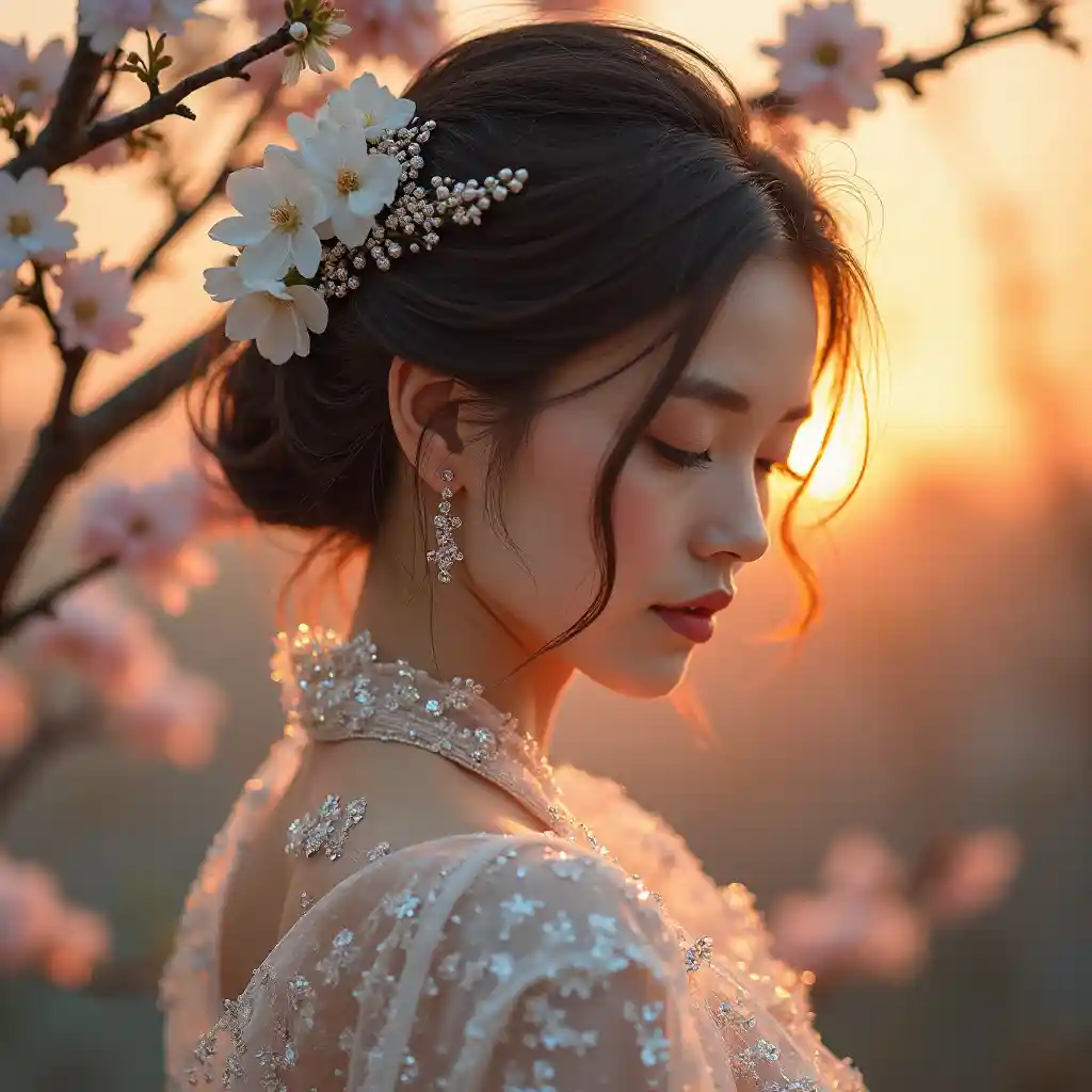 Hình ảnh này mô tả một người phụ nữ quyến rũ với khuôn mặt lý tưởng, trang điểm, kiểu tóc thanh lịch được trang trí bằng hoa trắng và các yếu tố lấp lánh. Khuôn mặt cô nghiêng sang một bên, hơi cúi xuống, tạo cho cô một cái nhìn trầm tư hoặc mơ màng. Trang phục của người phụ nữ này bao gồm một chiếc váy hoặc váy quấn lấp lánh ánh sáng bạc, mang lại ấn tượng rực rỡ và nhẹ nhàng. Những đường chỉ hoặc hoa văn lấp lánh, như những giọt sương lấp lánh hoặc bụi sao, dọc theo lưng và vai của cô ấy, làm nổi bật sự thanh lịch của cơ thể cô ấy. Bối cảnh nổi bật với ánh hoàng hôn rực rỡ và hoa anh đào nở rộ hoặc cành cây, thêm một bầu không khí lãng mạn cho bố cục. Ánh sáng nhẹ nhàng làm nổi bật các đặc điểm trên khuôn mặt của cô, tạo ra một cảm giác kỳ diệu và tinh tế.