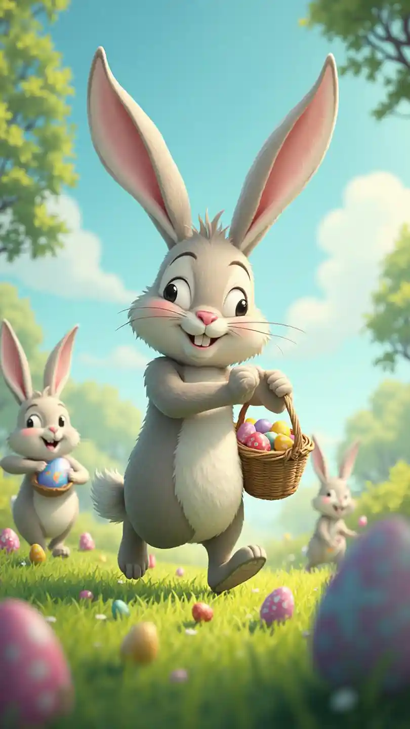 MichaelMột con thỏ lớn đứng ở trên một mảnh đất trống, mang theo một giỏ trứng, hình ảnh hoạt hình, chạy qua một mảnh cỏ xanh, thỏ rất nhiều, hắn là thủ lĩnh của bọn họ