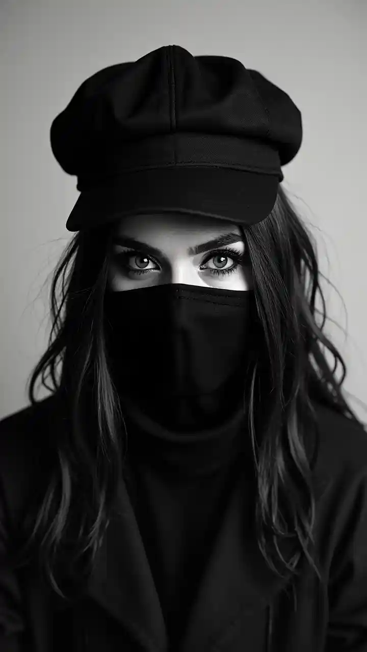 Image là một bức chân dung đen trắng mô tả một người đàn ông với phong cách bí ẩn và sắc sảo. Các đối tượng đội một chiếc mũ màu đen với vành mũ cong che một phần trán. Đôi mắt của họ có thể nhìn thấy nổi bật, được nhấn mạnh bằng đường kẻ mắt tối, mang lại một cái nhìn mạnh mẽ và hấp dẫn. Người đàn ông này có một mái tóc đen dài, lộ ra từ dưới mũ. Họ đeo một chiếc khăn màu đen hoặc vải quấn quanh nửa dưới khuôn mặt của họ, làm tăng thêm sự bí ẩn. Trang phục trông giống như một chiếc áo khoác tối màu, có họa tiết góp phần tạo nên tổng thể đơn sắc và thẩm mỹ thời trang. Nền là màu xám nhạt trơn, tương phản với trang phục màu tối, làm nổi bật các đặc điểm khuôn mặt và trang phục của đối tượng.