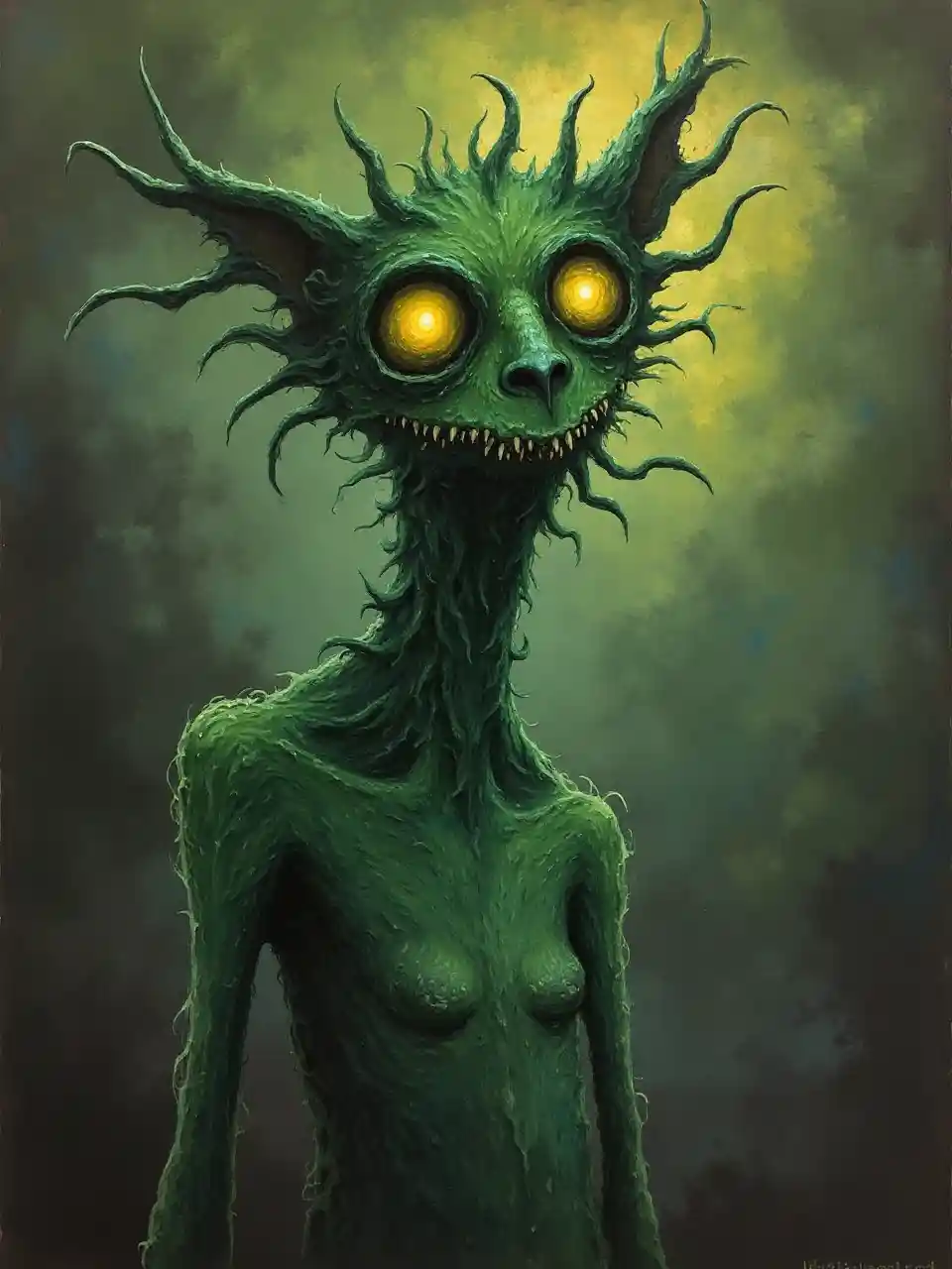 EllaThực thể Eldritch, sinh vật màu xanh lá cây kỳ lạ, chủ nghĩa biểu hiện trừu tượng, nỗi sợ vũ trụ, thế giới khác, bảng màu đáng ngại, Remedios Varo.