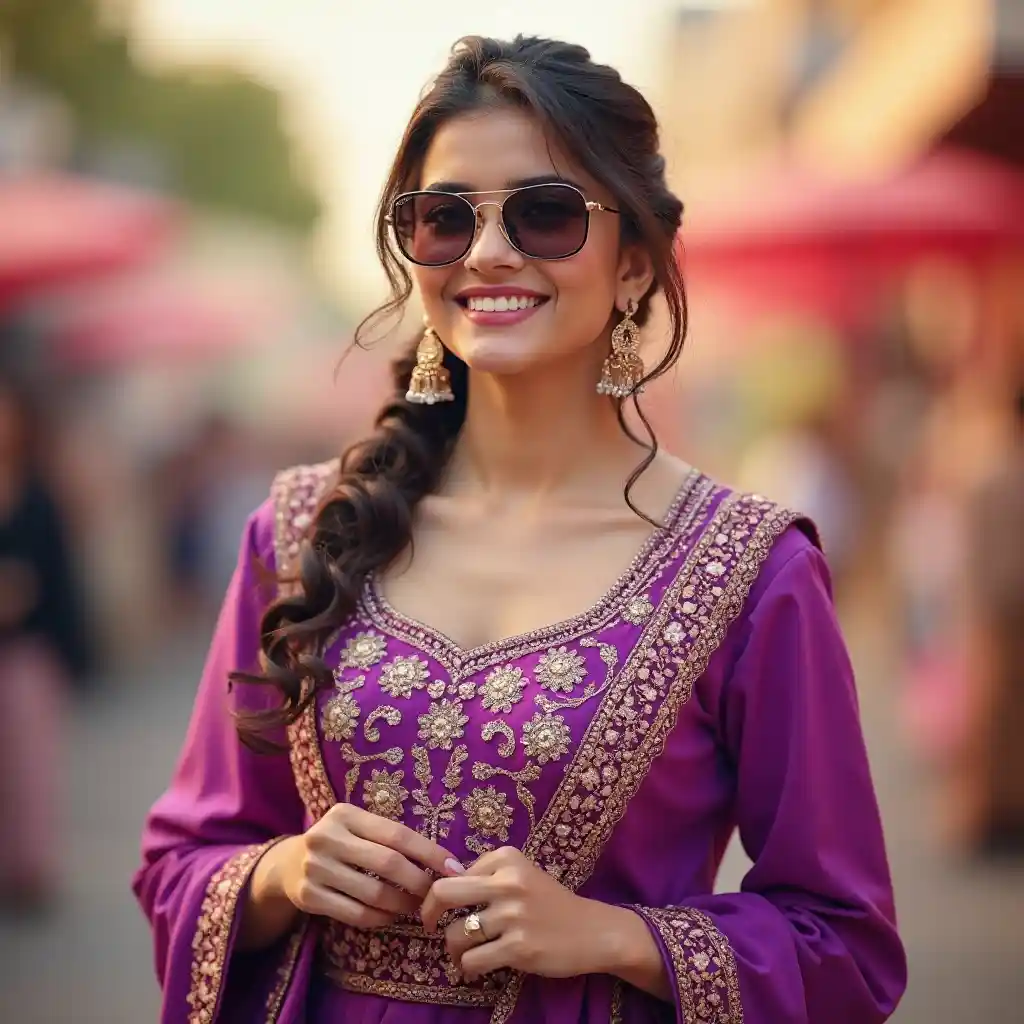 Toát lên vẻ sang trọng, một người phụ nữ trẻ đứng trong một khung cảnh ngoài trời sôi động trong một bộ đồ màu tím được thêu tinh xảo với các chi tiết vàng phức tạp và điểm nhấn tinh tế. Biểu cảm tự tin của cô ấy phù hợp với kính râm tròn thời trang và hoa tai cá tính, trong khi mái tóc của cô ấy được tạo kiểu gọn gàng, tôn lên phong thái thanh lịch của cô ấy. Nền, một màu sắc nhẹ nhàng mờ, ngụ ý một bầu không khí sống động, rất có thể là vào một ngày nắng. Hình ảnh ghi lại một cảm giác vui mừng và lễ kỷ niệm, nơi người phụ nữ tinh nghịch điều chỉnh trang phục của mình, phản ánh sự pha trộn hiện đại của thời trang truyền thống và hiện đại. Ánh sáng ấm áp làm nổi bật màu sắc phong phú của trang phục của cô, thêm sự quyến rũ cho toàn bộ khung cảnh.