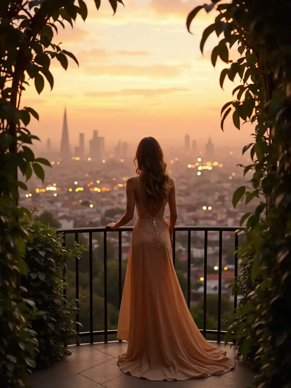 Một người phụ nữ mặc một chiếc váy vàng bồng bềnh, duyên dáng đứng trên ban công trang nhã, nhìn ra một khung cảnh thành phố rộng lớn đang đắm mình trong ánh sáng ấm áp của hoàng hôn. Đường chân trời để lộ những tòa nhà cao chót vót và ánh đèn lấp lánh, gợi lên cảm giác yên bình và tráng lệ. Màu xanh lá cây tươi tốt đóng khung ban công để nâng cao bầu không khí lãng mạn. Cảnh quay siêu chi tiết, chất lượng điện ảnh, toát lên sự tinh tế và thẩm mỹ.