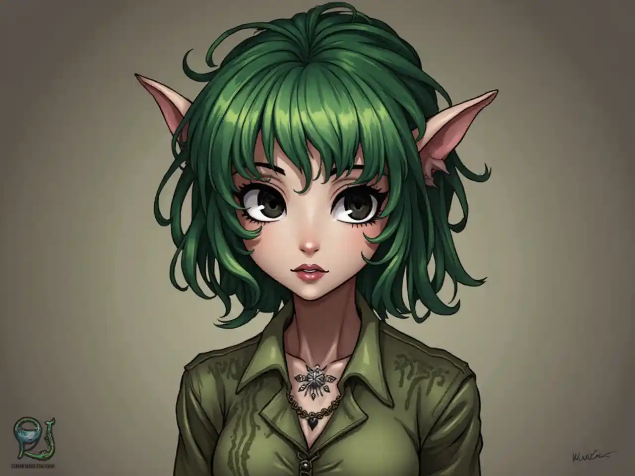 SophiaNgười phụ nữ, mái tóc màu xanh lá cây, đôi mắt đen, pixie, hình xăm