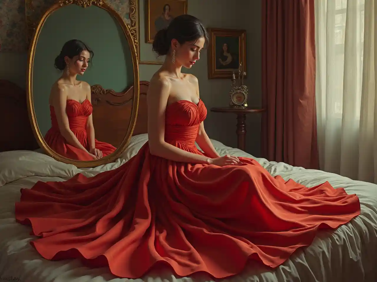 ElsaNgười phụ nữ mặc váy đỏ ngồi trên giường, phía sau là gương, vẽ một người phụ nữ mặc váy đỏ, Elina Karimova, nghệ thuật giả tưởng, tranh sơn dầu cực kỳ tỉ mỉ, một bức tranh chân thực