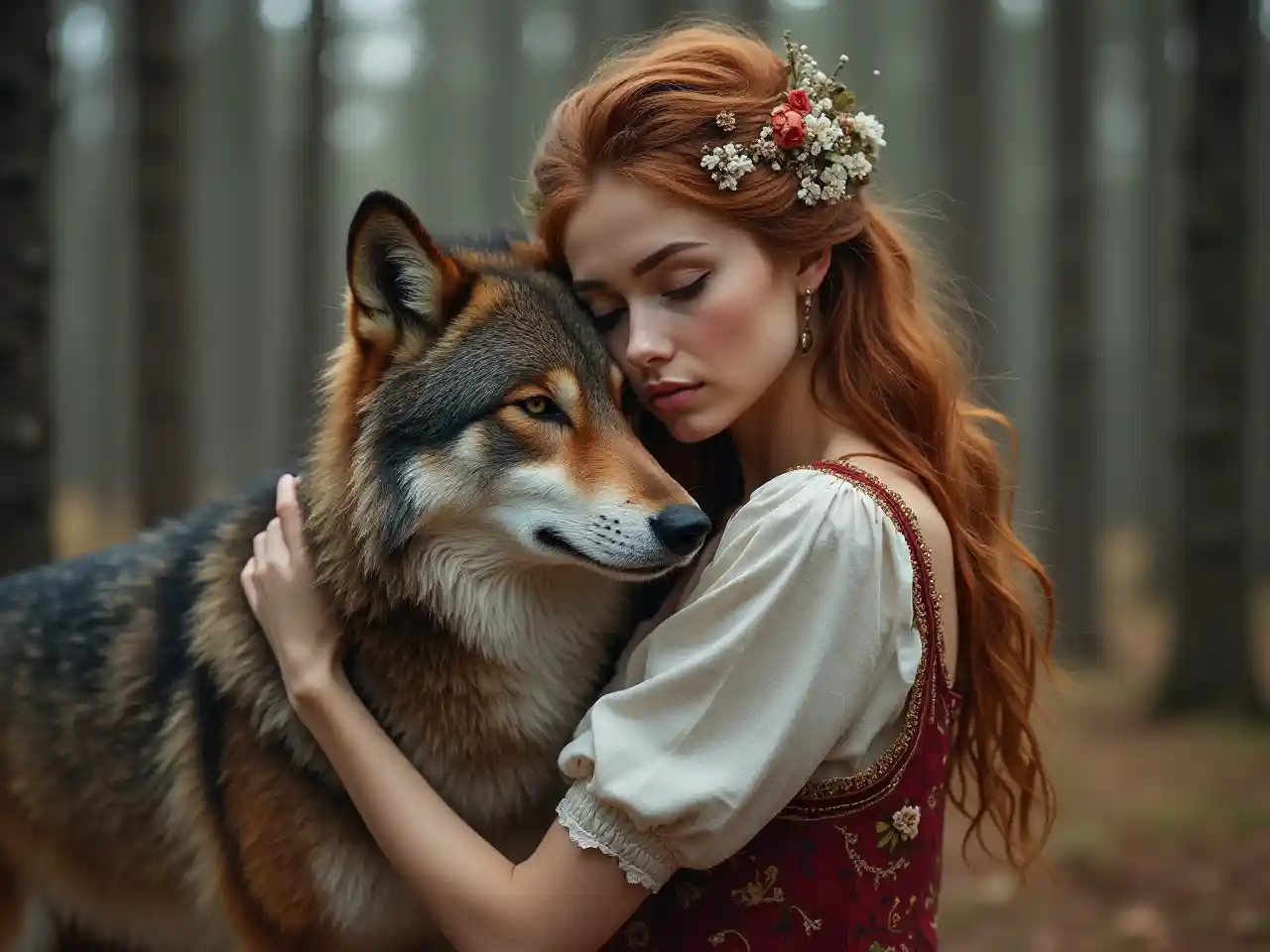 GabrielChân dung người đẹp trong truyện cổ tích Nga mặc trang phục truyền thống ôm sói