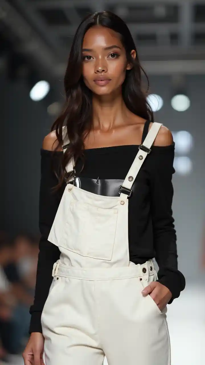 Siêu mẫu tuyệt đẹp với áo trễ vai màu đen và quần yếm màu trắng