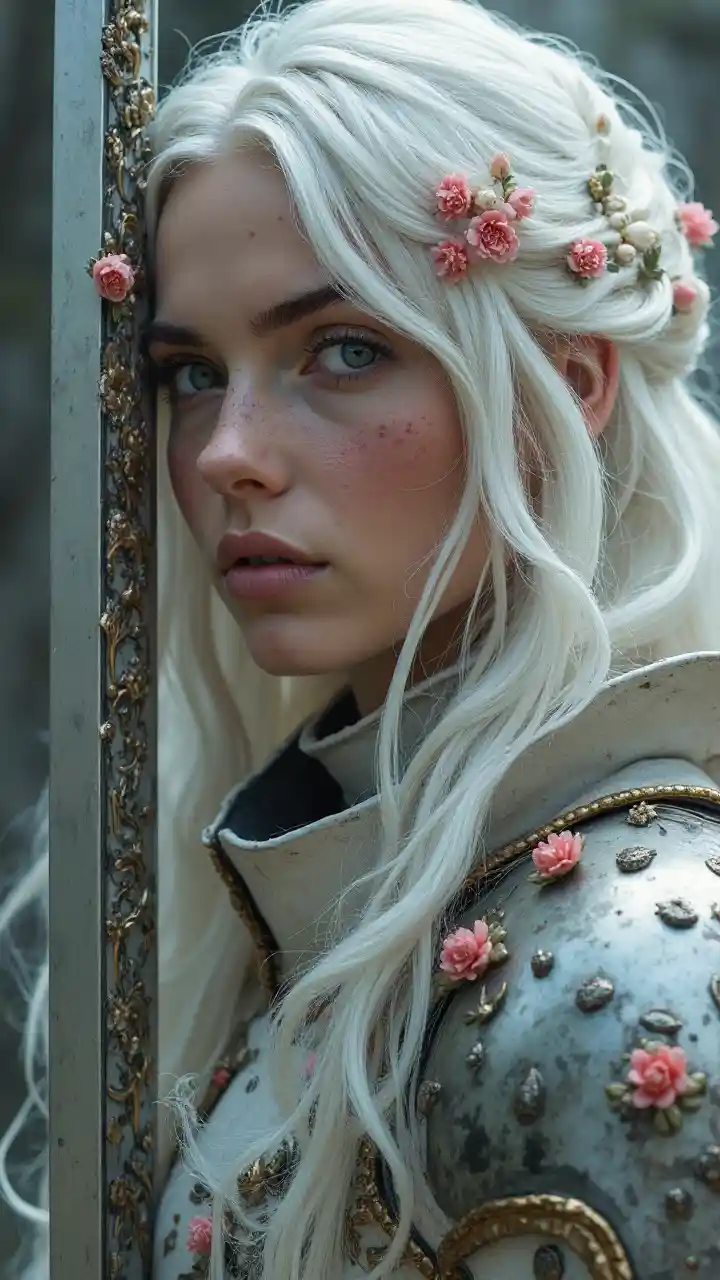 KinsleyTrắng da nữ tử + chiến sĩ + tóc trắng + mắt xám + áo giáp khắc hoa + liệt tọa một kiếm