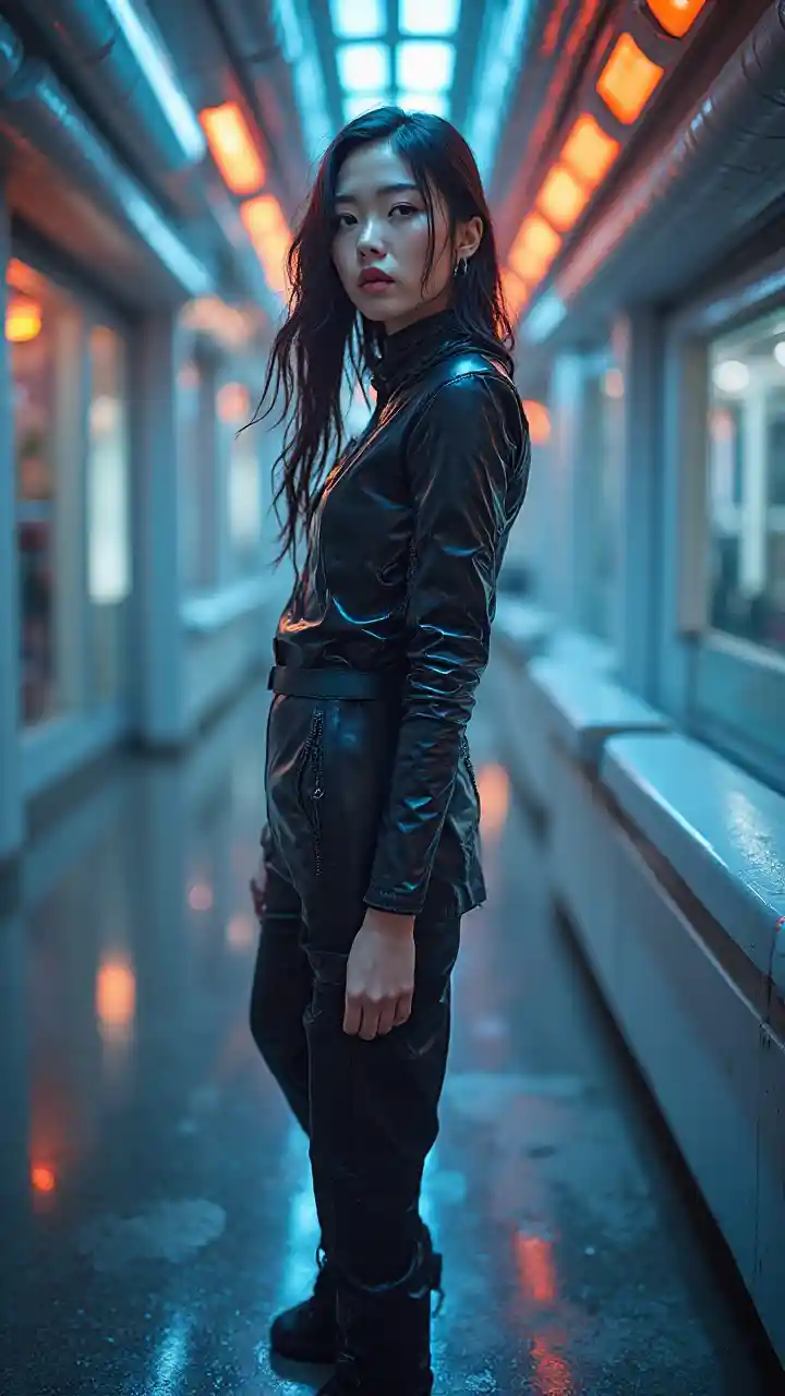Người phụ nữ Nhật Bản 30 tuổi có vẻ đẹp đáng kinh ngạc. Lấy bối cảnh của vũ trụ punk nguyên tử, trang phục của cô có các yếu tố tương lai nhưng thanh lịch. Chụp toàn bộ cơ thể cô trong một cảnh quay góc cao ấn tượng, tạo ra một trải nghiệm nhập vai điện ảnh. Bố cục tập trung vào cô ấy, thể hiện tư thế thanh lịch và biểu cảm tự tin của cô ấy trên nền của một tòa nhà kim loại bóng bẩy được truyền ánh sáng neon. Các cảnh được lấp đầy với các chi tiết sử thi, và mỗi yếu tố được xây dựng cẩn thận để nâng cao bầu không khí của chủ nghĩa tương lai.