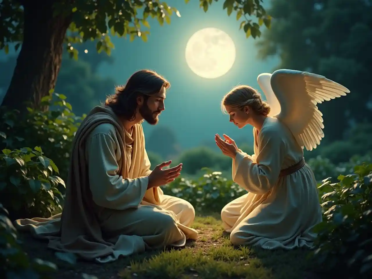Chúa Giêsu cầu nguyện trong Vườn Ghết-sê-ma-ni, tắm mình dưới ánh trăng nhẹ nhàng, thanh tao, một thiên thần cung cấp sự an ủi nhẹ nhàng, bầu không khí yên tĩnh, sự thanh thản của cảm xúc, xung quanh màu xanh lá cây tươi tốt, bóng râm tinh tế làm tăng cảnh, ánh sáng thiêng liêng chiếu sáng nhân vật, hình ảnh chất lượng cao, siêu chi tiết, khoảnh khắc tinh thần đầy cảm hứng.